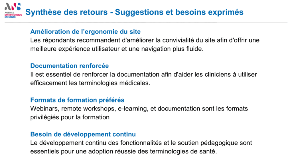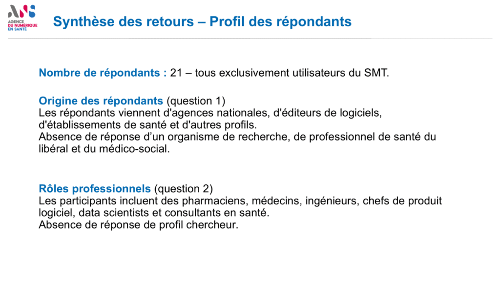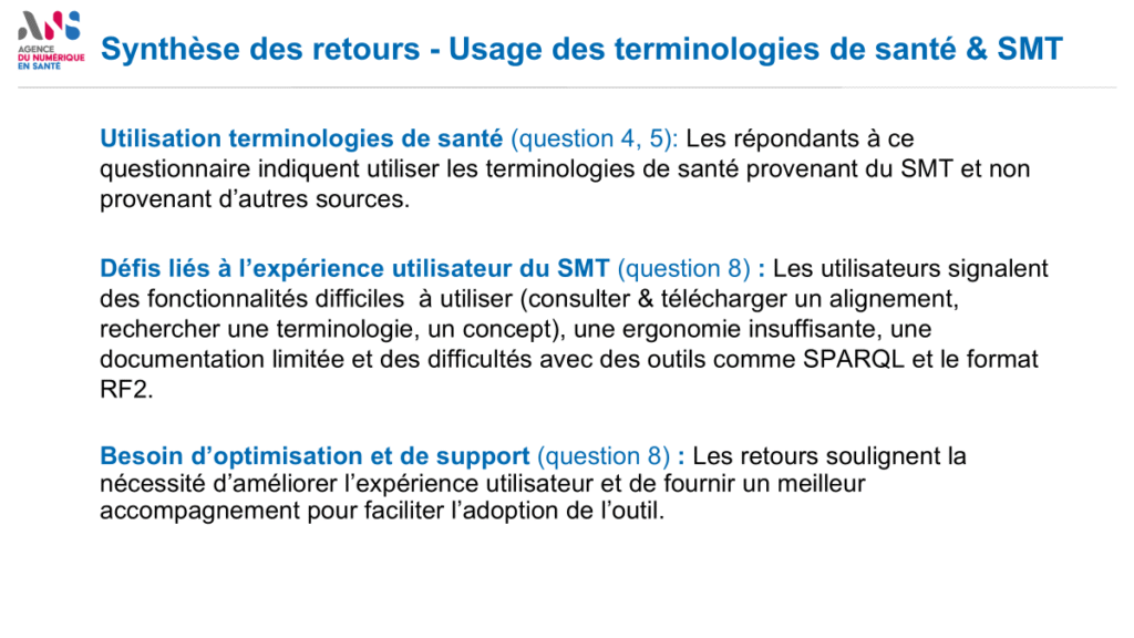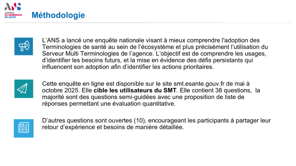 Au second semestre 2025, l’ANS a lancé une enquête pour recueillir vos retours sur l’utilisation de la plateforme Multi-Terminologies. Votre participation a été précieuse ! Elle nous a permis de mieux comprendre les usages actuels du SMT et d’identifier les axes d’amélioration pour 2026.